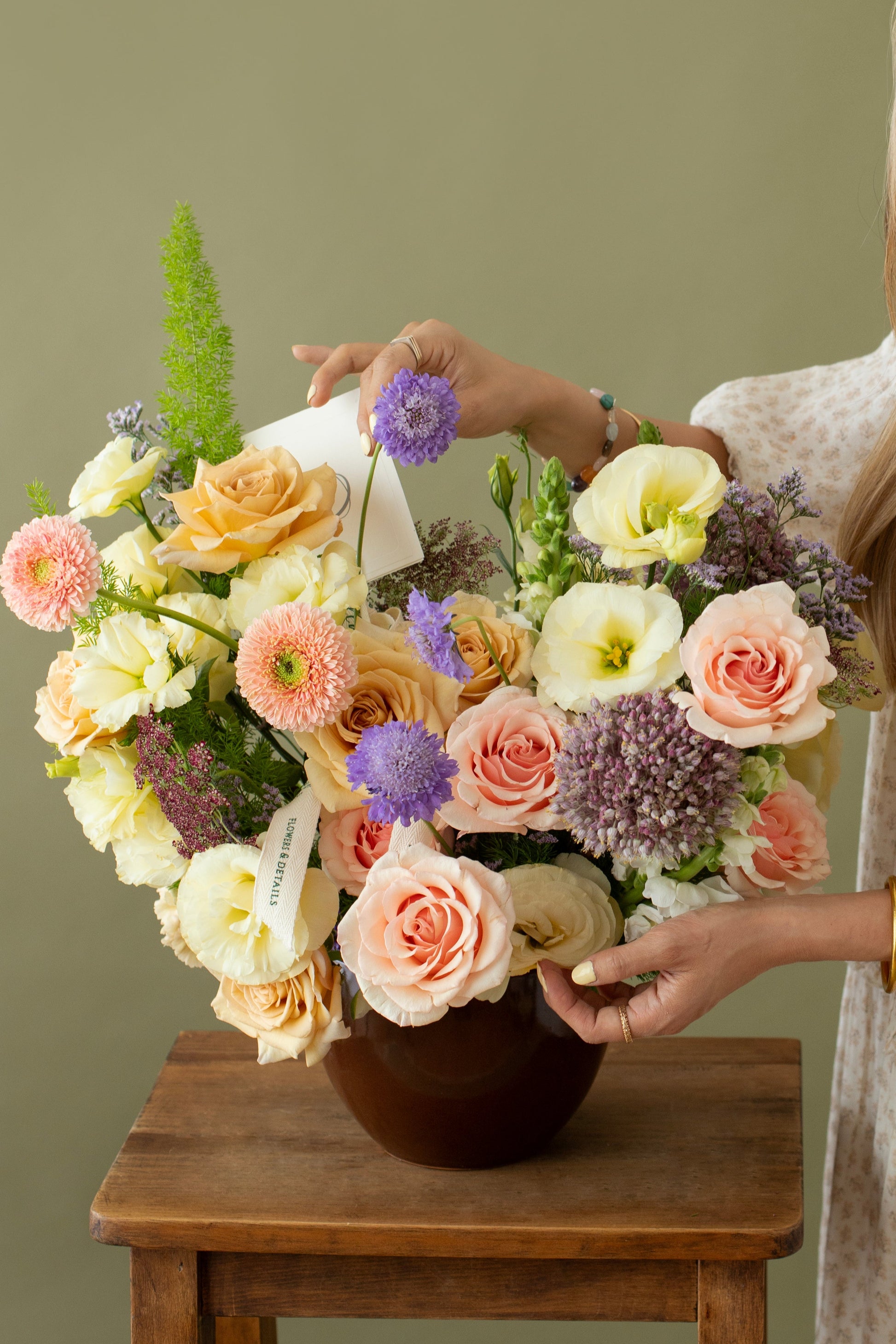 . El arreglo mediano de nuestra colección Mother´s Day 2025 está elaborado con una cuidadosa selección de flores en el que incluimos r osas, lisianthus, escabiosas, encajes, claveles, alstromerias, perritos, gerberas y follajes finos en tonalidades pastel que representan amor, ternura y sabiduría sobre un bowl de cerámica en tono café. Incluye tag conmemorativo a la colección y tarjeta dedicatoria.